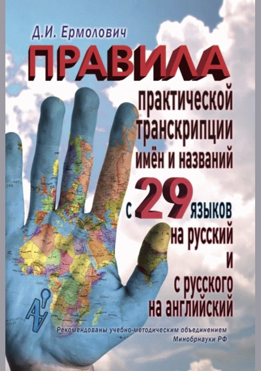 Ермолович, Д.И. Правила практической транскрипции имен и названий с 29 западных и восточных языков на русский и с русского языка на английский / Д. И. Ермолович. — Москва : Аудитория, 2016. — 125 с.. — ISBN 978-5-9907943-1-3.