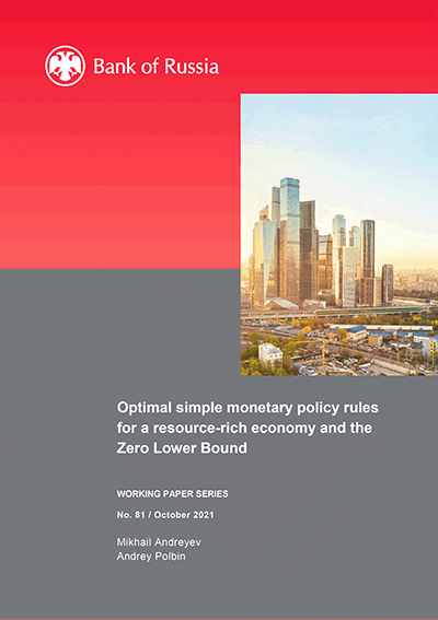 Andreyev, M. Optimal simple monetary policy rules for a resource-rich economy and the Zero Lower Bound / M. Andreyev, A. Polbin; The Central Bank of the Russian Federation, Research and Forecasting Department, RANEPA. — Moscow : Bank of Russia, october 2021. — 33 p.: il.. — (Working Paper Series; # 81). — References: p. 24-25.