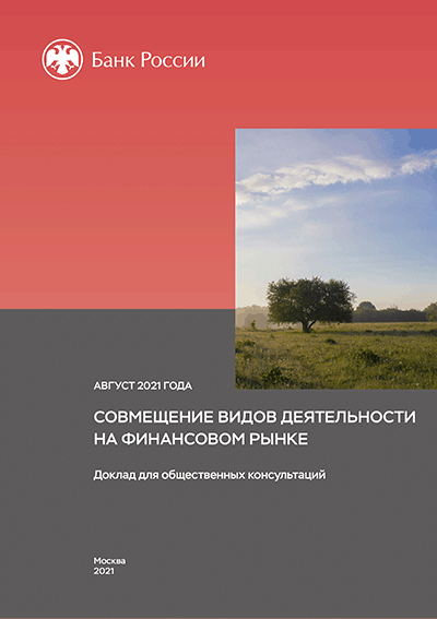Совмещение видов деятельности на финансовом рынке / Центральный банк Российской Федерации. — Москва : Банк России, август 2021. — 25 с.. — (Доклад для общественных консультаций).