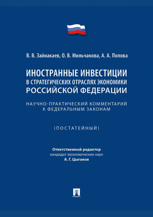 Зайнакаев, В.В. Иностранные инвестиции в стратегических отраслях экономики Российской Федерации : научно-практический комментарий к федеральным законам (постатейный) / В. В. Зайнакаев, О. В. Мильчакова, А. А. Попова; редактор А. Г. Цыганов; рецензенты: С. В. Максимов, А. В. Молчанов. — Москва : Проспект, 2025. — 376 с.. — ISBN 978-5-392-43603-3.