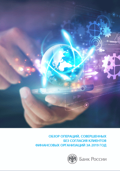 Обзор операций, совершенных без согласия клиентов финансовых организаций за 2019 год / Центральный банк Российской Федерации, Департамент информационной безопасности, Центр мониторинга и реагирования на компьютерные атаки в кредитно-финансовой сфере (ФинЦЕРТ). — Москва : Банк России, 2020. — 24 с.: граф., табл.