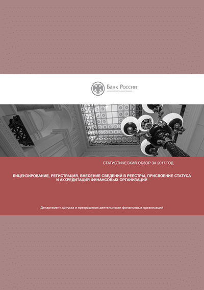 Статистический обзор за 2017 год : лицензирование, регистрация, внесение сведений в реестры, присвоение статуса и аккредитация финансовых организаций / Центральный банк Российской Федерации, Департамент допуска и прекращения деятельности финансовых организаций. — Москва : Банк России, [2018]. — 75 с.: граф., табл.