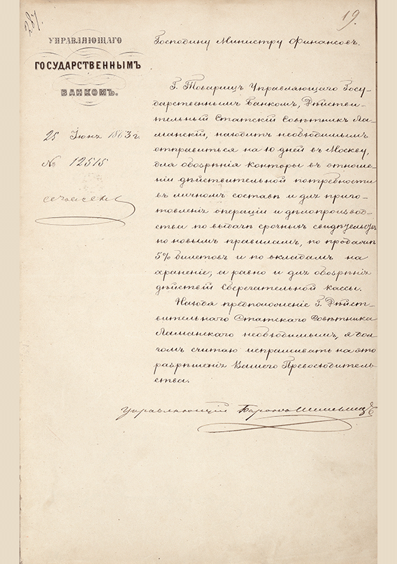Представление управляющего Государственным банком барона А.Л. Штиглица министру финансов М.Х. Рейтерну о командировке товарища управляющего Государственным банком действительного статского советника Е.И. Ламанского на десять дней в Москву : "для обозрения Конторы в отношении действительной потребности в личном составе и для приготовлении операции и делопроизводства по выдаче срочных свидетельств по новым правилам продажи 5% билетов и по вкладам на хранение; а равно и для обозрения действий Сберегательной кассы". 25 июня 1863 г. Автограф барона А.Л. Штиглица. — Б. м., 1863. — 1 с.. — . РГИА, Ф. 587. Оп. 11. Д. 86. Л. 19.
