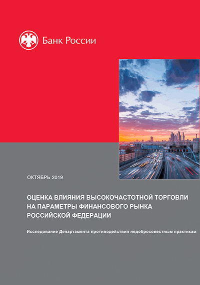 Оценка влияния высокочастотной торговли на параметры финансового рынка Российской Федерации. Ч. 2 : исследование Департамента противодействия недобросовестным практикам / Центральный банк Российской Федерации, Департамент противодействия недобросовестным практикам. — Москва : Банк России, октябрь 2019. — 16 с.: граф., табл.