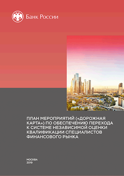 План мероприятий ("дорожная карта") по обеспечению перехода к системе независимой оценки квалификации специалистов финансового рынка / Центральный банк Российской Федерации, Университет Банка России. — Москва : Банк России, 2019. — 7 с.: табл.. — (Дорожная карта).