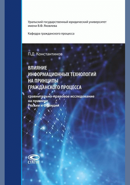 Константинов, П.Д. Влияние информационных технологий на принципы гражданского процесса : сравнительно-правовое исследование на примере России и Франции : монография / Уральский государственный юридический университет имени В.Ф. Яковлева. — Москва : Статут, 2023. — 272 с.. — ISBN 978-5-8354-1942-5.