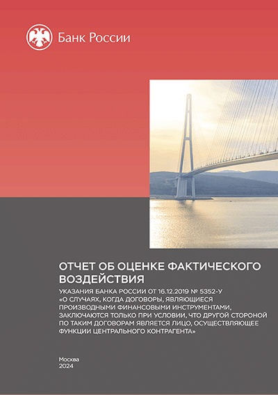 Отчет об оценке фактического воздействия Указания Банка России от 16.12.2019 № 5352-У "О случаях, когда договоры, являющиеся производными финансовыми инструментами, заключаются только при условии, что другой стороной по таким договорам является лицо, осуществляющее функции центрального контрагента" / Центральный банк Российской Федерации, Департамент стратегического развития финансового рынка. — Москва : Банк России, 2024. — 56 с.: граф., табл.