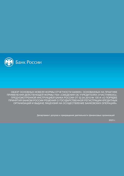 Обзор основных новелл формы отчетности 0409053, основанных на практике применения действующей формы 7504 "Сведения об учредителях (участниках)", предусмотренной Инструкцией Банка России от 02.04.2010 № 135-И "О порядке принятия Банком России решения о государственной регистрации кредитных организаций и выдаче лицензий на осуществление банковских операций" [Слайды] / Центральный банк Российской Федерации, Департамент допуска и прекращения деятельности финансовых организаций. — Москва : Банк России, 2023. — 31 сл.: цв. ил., табл.. — (Материалы обучающих вебинаров Департамента допуска и прекращения деятельности финансовых организаций).
