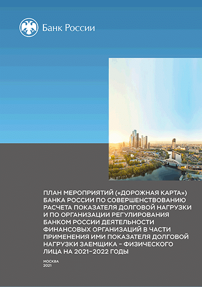 План мероприятий ("дорожная карта") Банка России по совершенствованию расчета показателя долговой нагрузки и по организации регулирования Банком России деятельности финансовых организаций в части применения ими показателя долговой нагрузки заемщика - физического лица на 2021-2022 годы / Центральный банк Российской Федерации, Департамент финансовой стабильности. — Москва : Банк России, 2021. — 8 с.: табл.. — (Дорожная карта).