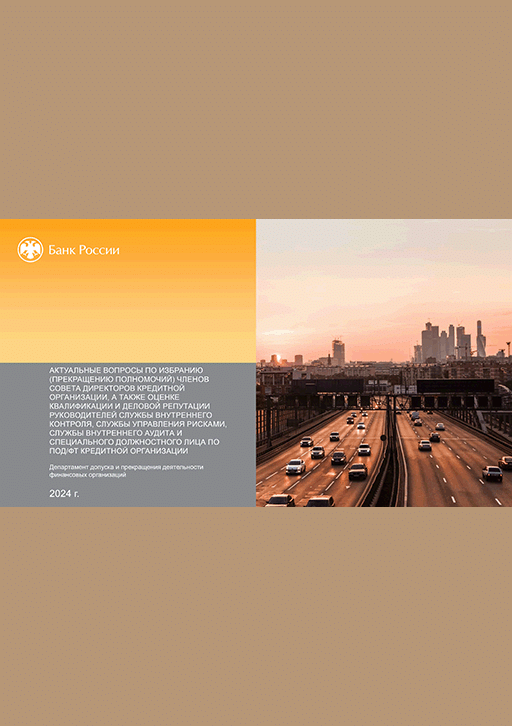 Актуальные вопросы по избранию (прекращению полномочий) членов совета директоров кредитной организации, а также оценке квалификации и деловой репутации руководителей службы внутреннего контроля, службы управления рисками, службы внутреннего аудита и специального должностного лица по ПОД/ФТ кредитной организации [Слайды] / Центральный банк Российской Федерации, Департамент допуска и прекращения деятельности финансовых организаций. — Москва : Банк России, 2024. — 28 сл.: цв. ил.. — (Материалы обучающих вебинаров Департамента допуска и прекращения деятельности финансовых организаций).