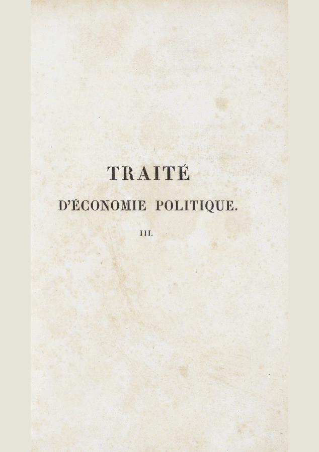 Say, J.-B. Traité d'économie politique, ou simple exposition de la manière dont se forment, se distribuent et se consomment les richesses. T. 3 / J.-B. Say. — 5e éd.. — Paris : Chez Rapilly, Libraire, 1826. — iij, 435 p.: табл.-1. — Index: p. 331-435. Содержание : Épitome des principes fondamentaux de l'économie politique (стр.255-330). — (в пер.) : 25.00 р.