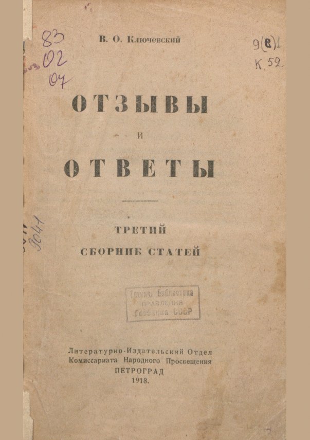 Ключевский, В.О. Отзывы и ответы : третий сборник статей / В.О. Ключевский. — Петроград : Лит.- Изд. Отдел Комиссариата Народного Просвещения, 1918. — 445, XXVI с.. — (в пер.) : 25.00 р.
