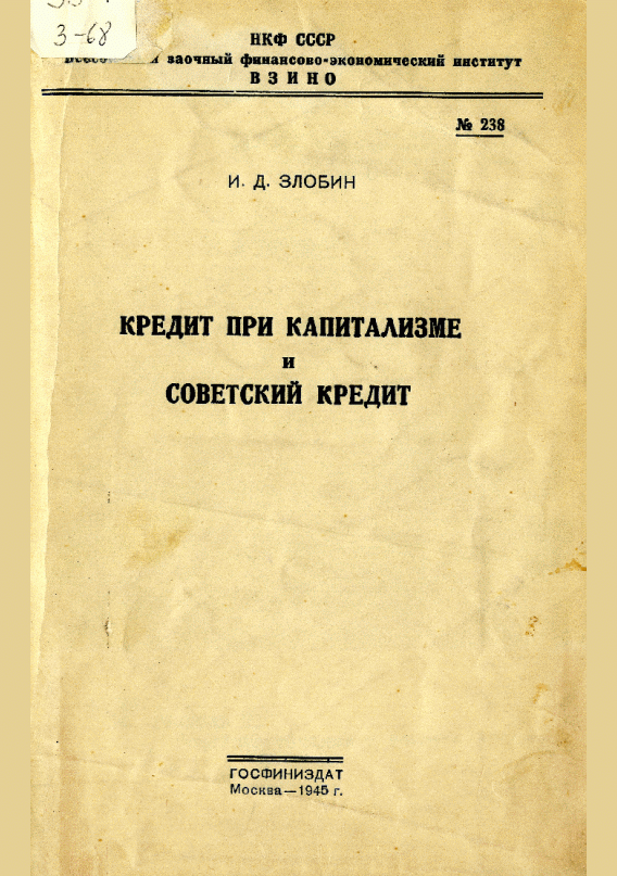 Злобин, И.Д. Кредит при капитализме и советский кредит / И.Д. Злобин; Всесоюз. заоч. фин.-экономич.ин-т ВЗИНО НКФ СССР. — Москва : Госфиниздат, 1945. — 38 с.