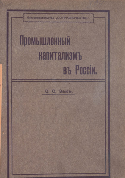 Зак, С.С. Промышленный капитализм в России / С. С. Зак. — Москва : Книгоиздательство "Сотрудничество", 1908. — VII, 172 с.. — . Напечатано по старой орфографии.