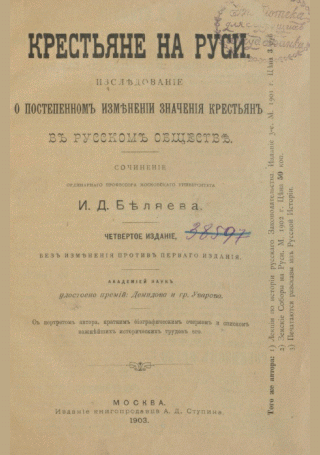 Беляев, И.Д. Крестьяне на Руси : исследование о постепенном изменении значения крестьян в русском обществе / И. Д. Беляев. — 4-е изд., без изм. против первого изд., Акад. наук удостоено премий: Демидова и гр. Уварова. — Москва : Издание книгопродавца А.Д. Ступина, 1903. — XII, 306 с.: портр.. — . Напечатано по старой орфографии.