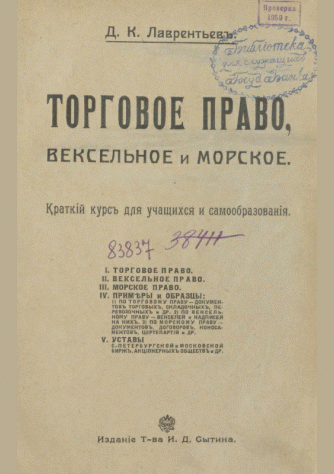 Лаврентьев, Д.К. Торговое право, вексельное и морское : краткий курс для учащихся и самообразования / Д. К. Лаврентьев. — Москва : Издание Товарищества И.Д. Сытина, 1913. — 415 с.. — . Напечатано по старой орфографии.. Алф. указ.: с. 405-415. Содержание : Торговое право ; Вексельное право ; Примеры и образцы ; Уставы: Санкт-Петербургской и Московской бирж, акционерных обществ и др.