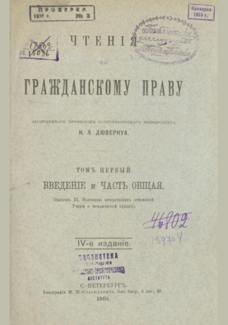 Дювернуа, Н.Л. Чтения по гражданскому праву. Т. 1. Введение и часть общая. Изменение юридических отношений. Учение о юридической сделке / Н. Л. Дювернуа. — 4-е изд.. — Санкт-Петербург : Типография М.М. Стасюлевича, 1905. — 286 с.. — . Напечатано по старой орфографии.