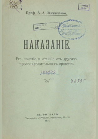 Жижиленко, А.А. Наказание : его понятие и отличие от других правоохранительных средств / А. А. Жижиленко. — Петроград : Типография "Правда", 1914. — 696 с.. — . Напечатано по старой орфографии.