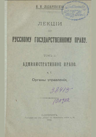 Лазаревский, Н.И. Лекции по русскому государственному праву. Т. 2. Административное право. Органы управления / Н. И. Лазаревский. — Санкт-Петербург : Типография акционерного общества "Слово", 1910. — 276 с.. — . Напечатано по старой орфографии.