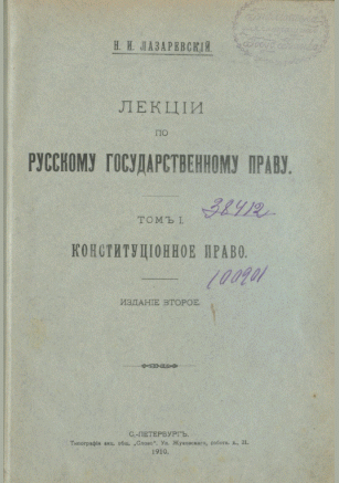 Лазаревский, Н.И. Лекции по русскому государственному праву. Т. 1. Конституционное право / Н. И. Лазаревский. — 2-е изд.. — Санкт-Петербург : Типография акционерного общества "Слово", 1910. — 479 с.. — . Напечатано по старой орфографии.