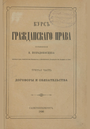 Победоносцев, К.П. Курс гражданского права. Ч. 3. Договоры и обязательства / К. Победоносцев. — Санкт-Петербург : Синодальная типография, 1896. — 644 с.. — . Напечатано по старой орфографии.