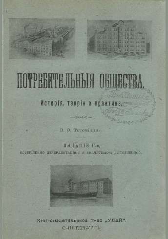Тотомианц, В.Ф. Потребительные общества : история, теория и практика / В. Ф. Тотомианц. — 2-е изд., совершенно перераб. и значительно доп.. — Санкт-Петербург : Улей, [1908]. — 411 с.. — . Напечатано по старой орфографии.