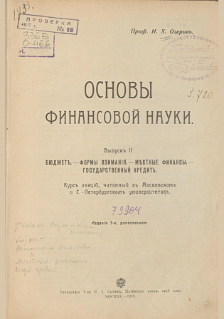 Озеров, И.Х. Основы финансовой науки. Вып. 2. Бюджет. Формы взимания. Местные финансы. Государственный кредит : курс лекций, читанный в Московском и Санкт-Петербургском университетах / И. Х. Озеров. — 3-е изд., доп.. — Москва : Типография Товарищества И.Д. Сытина, 1910. — 364 с.. — . Напечатано по старой орфографии.