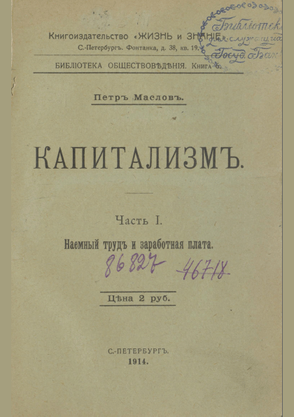 Маслов, П. Капитализм. Ч. 1. Наемный труд и заработная плата / П. Маслов. — Прижизн. изд.. — Санкт-Петербург : Жизнь и знание, 1914. — 434 с.. — (Библиотека обществоведения; кн. 6). — . Напечатано по старой орфографии.