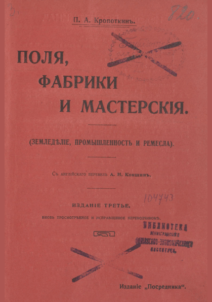 Кропоткин, П.А. Поля, фабрики и мастерские : (земледелие, промышленность и ремесла) / П. А. Кропоткин; перевод с английского А. Н. Коншин. — 3-е изд., испр., прижизн. изд. — Москва : Типо-литография Товарищества И.Н. Кушнерев и Ко, 1908. — 220 с.: рис. и чертежи. — (Издание "Посредника"; № 715). — . Напечатано по старой орфографии.