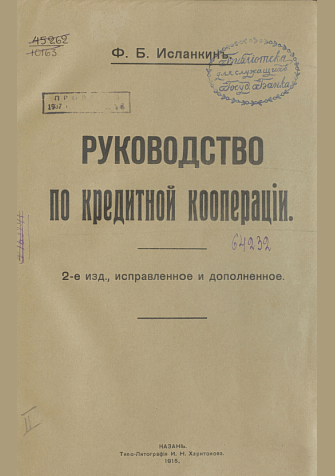 Исланкин, Ф.Б. Руководство по кредитной кооперации / Ф. Б. Исланкин. — 2-е изд., испр. и доп.. — Казань : Типо-Литография И.Н. Харитонова, 1915. — 328 с.. — . Напечатано по старой орфографии.