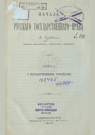 О государственном устройстве. — Санкт-Петербург : Типография М. Стасюлевича, 1875. — 436 с.. — . Напечатано по старой орфографии.. — 75.00 р.