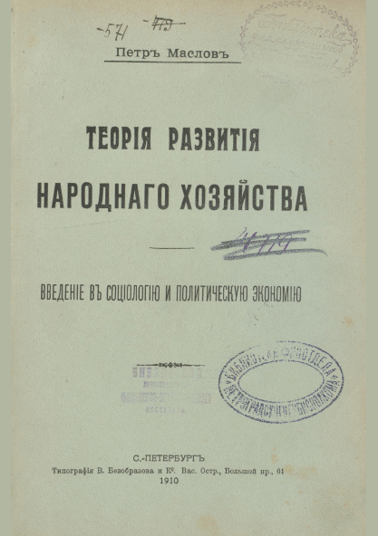 Маслов, П. Теория развития народного хозяйства : введение в социологию и политическую экономию / П. Маслов. — Санкт-Петербург : Типография В. Безобразова и Ко, 1910. — 379 с.. — . Напечатано по старой орфографии.