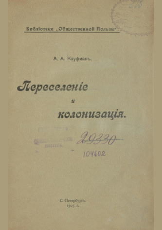 Кауфман, А.А. Переселение и колонизация / А. А. Кауфман. — Прижизн. изд.. — Санкт-Петербург : Общественная Польза, 1905. — IX, 349 с.. — (Библиотека "Общественной Пользы"). — . Напечатано по старой орфографии.