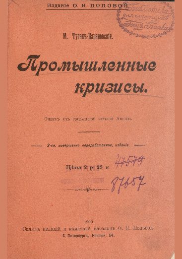 Туган-Барановский, М.И. Промышленные кризисы : очерк из социальной истории Англии / М. Туган-Барановский. — 2-е изд., перераб., прижизн. изд.. — Санкт-Петербург : Издание О.Н. Поповой, 1900. — 330 с.. — (Экономическая библиотека). — . Напечатано по старой орфографии.