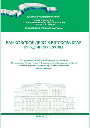 Банковское дело в Вятском крае: путь длиною в 200 лет : сборник рефератов победителей конкурса, посвященного 150-летию Банка России, 145-летию Вятского отделения Государственного банка, 200-летию открытия Слободского городского общественного Анфилатова банка / Центральный банк Российской Федерации, Главное управление по Кировской области. — Киров, 2010. — 138 с.: ил.. — 200.00 р.