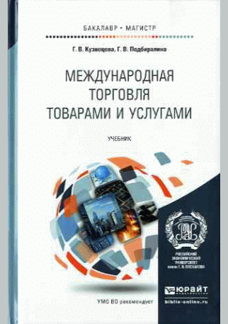 Кузнецова, Г.В. Международная торговля товарами и услугами : учебник для бакалавриата и магистратуры / Г. В. Кузнецова, Г. В. Подбиралина; Российская экономическая академия им. Г.В. Плеханова. — Москва : Юрайт, 2016. — 434 с.: граф., табл.. — (Бакалавр - Магистр. Академический курс). — Библиогр.: с. 428-433. — ISBN 978-5-9916-6564-3 : 1215.00 р.