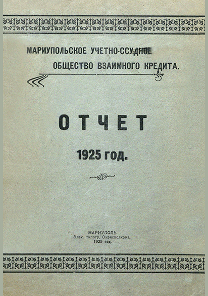 Отчет Мариупольского учетно-ссудного общества взаимного кредита за 1925 год / Мариупольское учетно-ссудное общество взаимного кредита. — Мариуполь : Электрическая типография Окрисполкома, 1925. — 27, [4] с.: обр., табл., 1 вкл. л. "Годовая оборотная ведомость Мариупольского учетно-ссудного общества взаимного кредита за 1924-1925 операционный год".