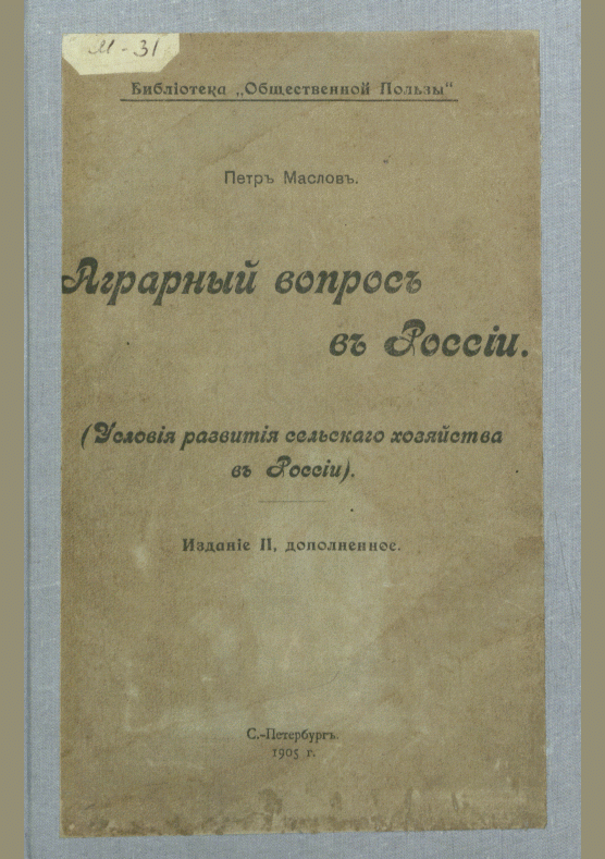 Маслов, П. Аграрный вопрос в России : Условия развития крестьянского хозяйства в России / П. Маслов. — Изд. 2-е, доп.. — С.-Пб., 1905. — 455 с.. — (Библиотека "Общественная Польза"). — . Напечатано по старой орфографии. — 16.00 р.