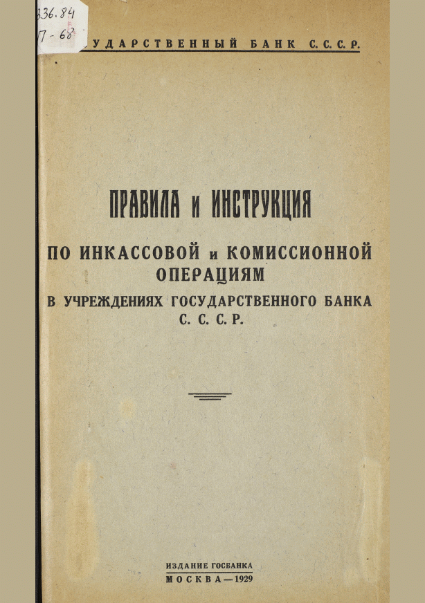 Правила и инструкция по инкассовой и комиссионной операциям в учреждениях Государственного банка СССР. — Москва : Издание Госбанка, 1929. — 47 с.
