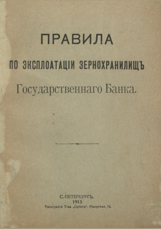 Правила по эксплуатации зернохранилищ Государственного банка / Государственный банк. — Утверждены г. Министром финансов 31 июля 1913 г.. — Санкт-Петербург : Типография Товарищества "Орбита", 1913. — 47 с.: обр.. — . Напечатано по старой орфографии.