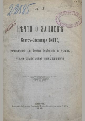 Хомяков, Д.А. Нечто о записке статс-секретаря Витте, составленной для Особого совещания по делам сельско-хозяйственной промышленности / Д. А. Хомяков. — Харьков : Типография Губернского правления, 1905. — 22 с.. — . Напечатано по старорусской орфографии.