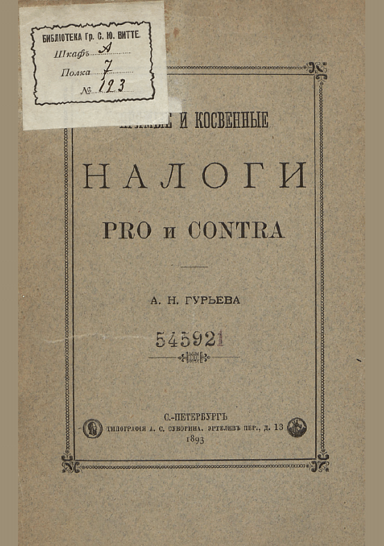 Гурьев, А.Н. Прямые и косвенные налоги. Pro и Contra / А. Н. Гурьев. — Электрон. текстовые дан.. — Санкт-Петербург : Типография А.С. Суворина, 1893. — 120 с.. — . Напечатано по старой орфографии.
