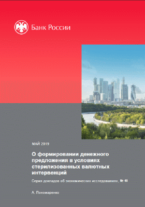 Пономаренко, А.А. О формировании денежного предложения в условиях стерилизованных валютных интервенций / А. Пономаренко; Банк России, Департамент исследований и прогнозирования. — Электрон. текстовые дан.. — Банк России, 2019, май. — 28 с.: цв. ил., граф.. — (Серия докладов об экономических исследованиях; № 40). — Библиогр.: с. 22-24.