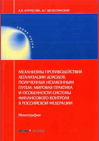 Буртасова, А.В. Механизмы противодействия легализации доходов, полученных незаконным путем, Mechanisms of counteraction of legalization of income obtained by illegal means : мировая практика и особенности системы финансового контроля в Российской Федерации : монография / А. В. Буртасова, Д. Г. Шелестинский. — Москва : Юстицинформ, 2019. — 92 с.: ил.. — (Наука). — Библиогр.: с. 85-91. — ISBN 978-5-7205-1510-2.