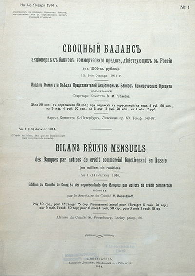 Сводный баланс акционерных банков коммерческого кредита, действующих в России (в 1000-х рублей), Bilans Réunis Mensuels des Banques par actions de crédit commercial fonctionnant en Russie (en milliers de roubles). № 1 : на 1-ое января 1914 г. / Комитет Съезда представителей акционерных банков коммерческого кредита; редактор В. М. Русаков. — Санкт-Петербург : Типография "Экономия", 1914. — 14 с.: табл.. — . Напечатано по старой орфографии.