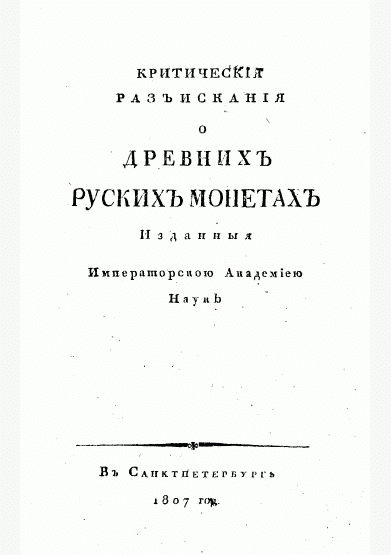 Круг, Ф. Критические разыскания о древних русских монетах / Ф. Круг. — Санктпетербург : Императорская Академия Наук, 1807. — 274 с.. — . Напечатано по старой орфографии.