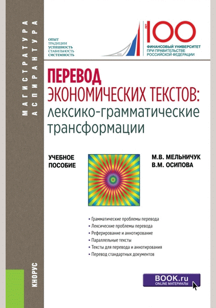 Мельничук, М.В. Перевод экономических текстов : лексико-грамматические трансформации: учебное пособие для вузов / М. В. Мельничук, В. М. Осипова; Финансовый университет при Правительстве Российской Федерации. — Электрон. текстовые дан.. — Москва : КноРус, 2020. — 158 с.: ил.. — (Магистратура и аспирантура). — Библиогр.: с. 158. — ISBN 978-5-406-06826-7 : 25000.00 р.