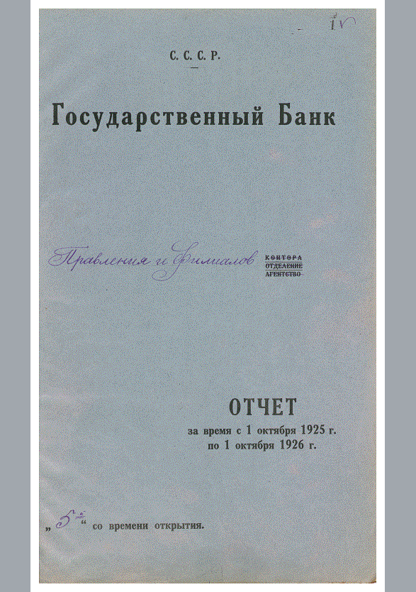 Отчет Государственного банка за 1925-1926 годы (год пятый) (проект). — Москва : Госбанк СССР, [1926]. — 420 с.: табл.