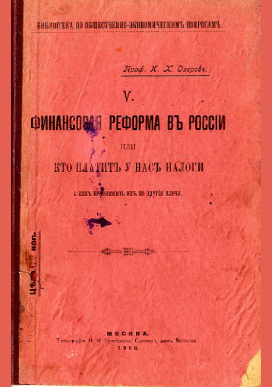 Озеров, И.Х. Финансовая реформа в России: откуда у нас государство берет деньги и на что их расходует / И.Х. Озеров. — Москва : Типо-литография И.И. Пашкова, 1906. — 151 с.. — (Библиотека по общественно-экономическим вопросам; V). — . Напечатано по старой орфографии. — (в пер.) : 20.00 р.