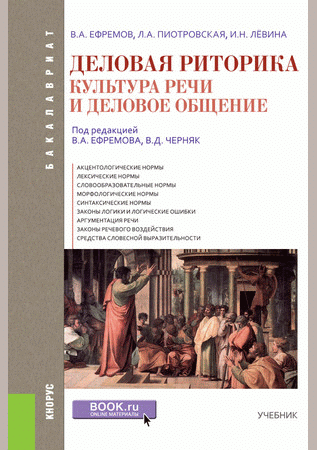 Ефремов, В.А. Деловая риторика : культура речи и деловое общение : учебник / В. А. Ефремов, Л. А. Пиотровская, И. Н. Левина; редакторы: В. А. Ефремов, В. Д. Черняк. — Москва : Кнорус, 2021. — 216 с.: табл.. — ISBN 978-5-406-07456-5.